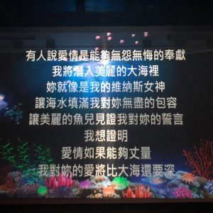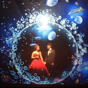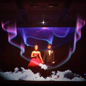 我們常以電腦動畫結合實境製作多媒體內容,這看上去既真實又夢幻。魔幻浮空投影的預設主題:情比海深(海洋情境)、雲端上的幸福(星空情境)、幸福堡壘(夢幻城堡)、愛予無暇(奇幻場景)等,用在宴會中新人登場,讓賓客留下難忘的回憶與話題。